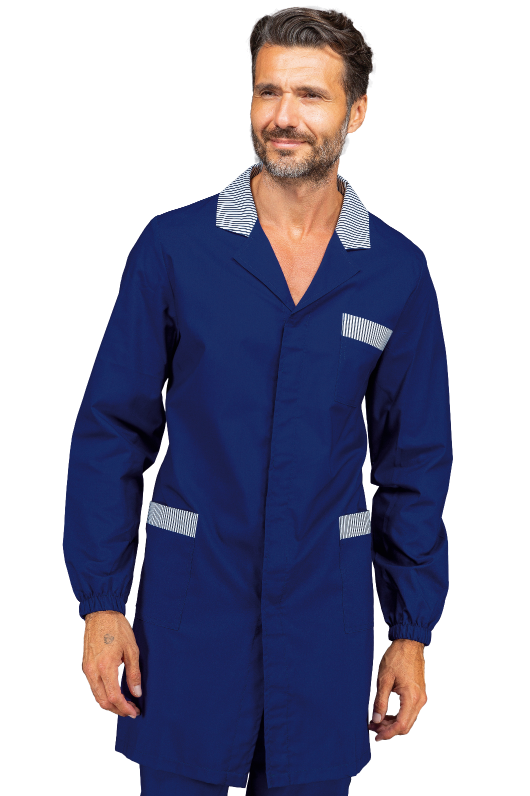 Camice da uomo Toronto lungo 100 cm con inserti a manica lunga blu e righe blu. Settore medicale, estetico, sanitario e industria. Ottima divisa da lavoro per farmacista e magazziniere. Bottoni a pressione coperti e tasche e taschino al petto.