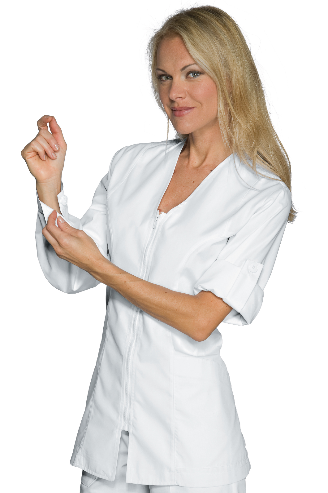 La casacca Benidorm è una camicia da donna a manica lunga bianco. Ideale per settore medico, sanitario, estetico e alimentare. Utilizzata come divisa da lavoro per aziende di servizi. Con cerniera, senza collo e 2 tasche.