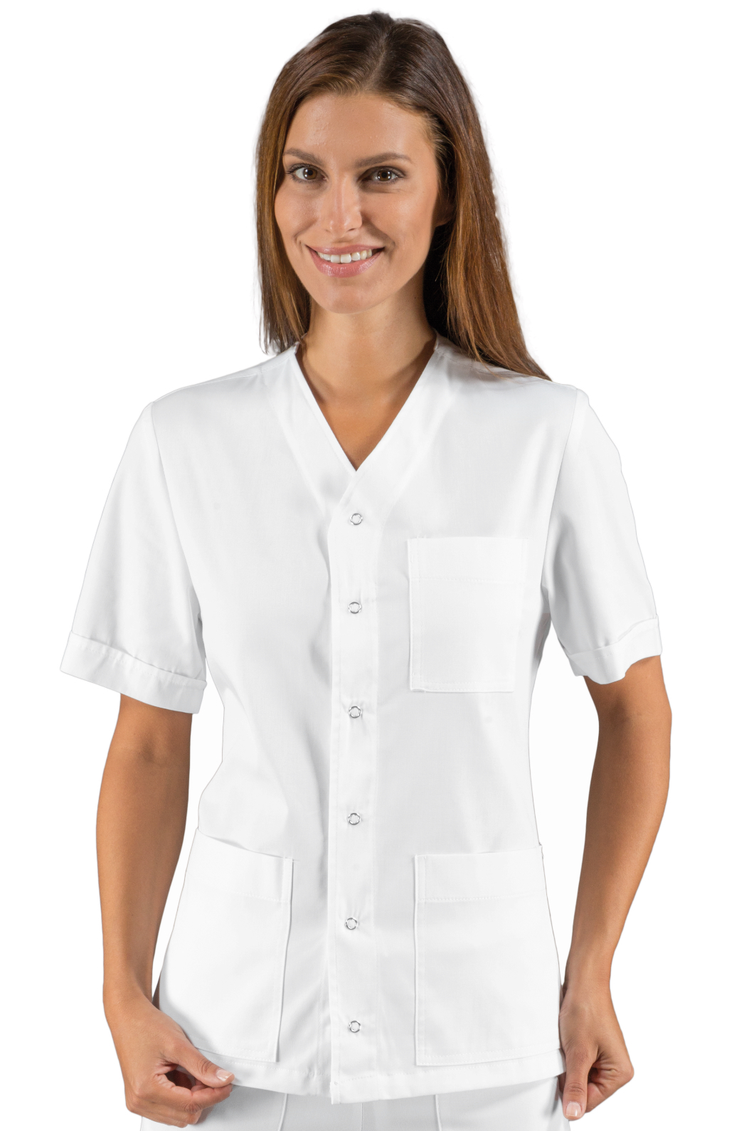 La casacca Zuoz è una camicia a mezza manica bianco. Per settore medicale,estetico, sanitario e ospedaliero. Adatta come divisa uomo e donna da lavoro per medico ed infermiere. Chiusura con bottoni pressione e con 2 tasche e taschino e collo a V.