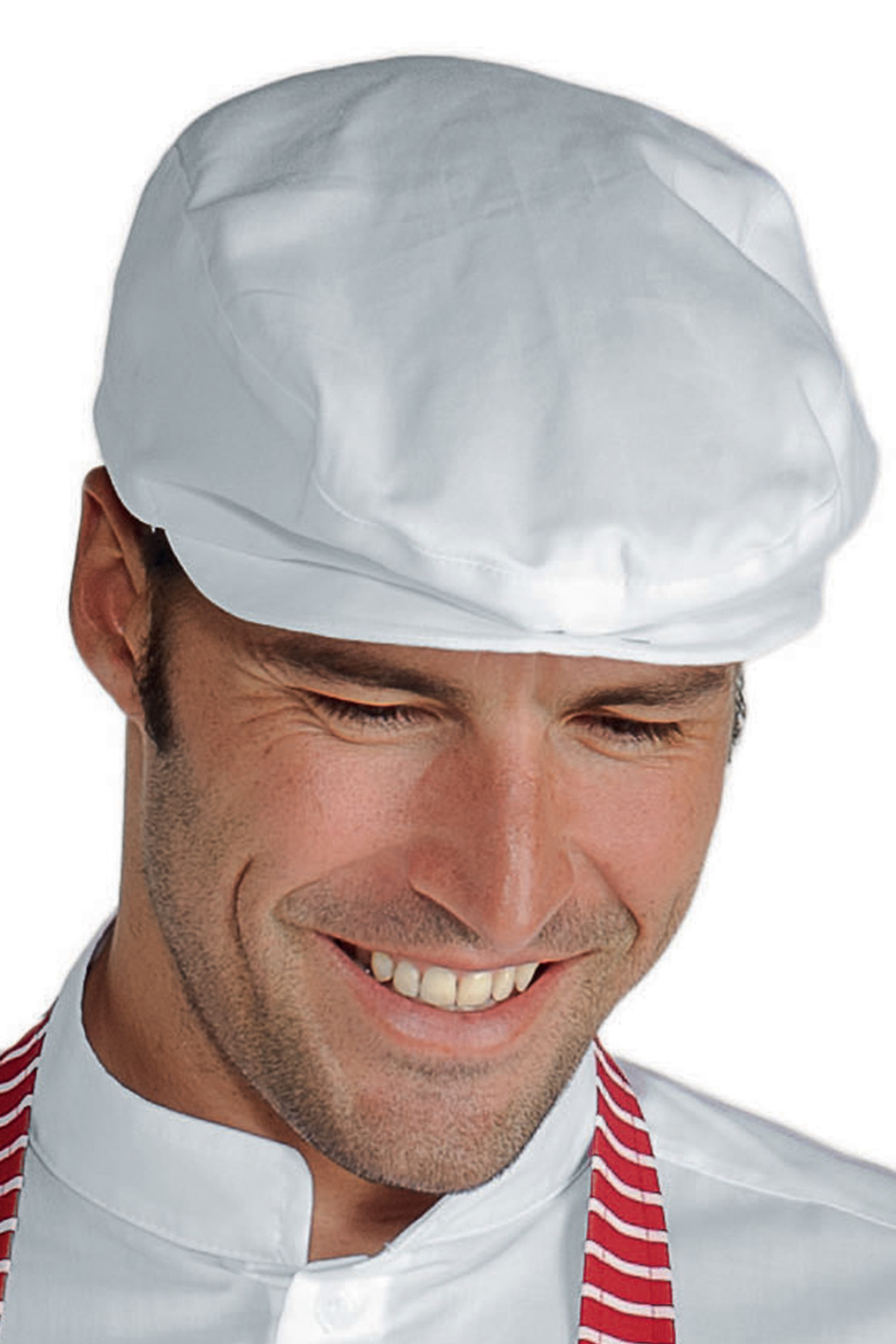 Coppola regolabile tramite velcro e visiera rigida bianco. Per il settore alberghiero e ristorazione. Divisa lavoro per cuoco, bar, pub, ristoranti, negozi alimentari e cucine. Usata in cucina in alternativa alla bustina, alla cuffia o al cappello.