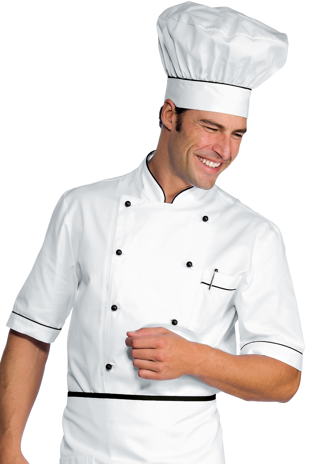 La Giacca da Cuoco con codino Alicante a mezza manica bianco e nero. Perfetta divisa da chef in cucina, ristorante o catering. Allacciatura con 10 bottoni antipanico estraibili. Ottima per sconfiggere la calura, soprattutto nella stagione estiva.