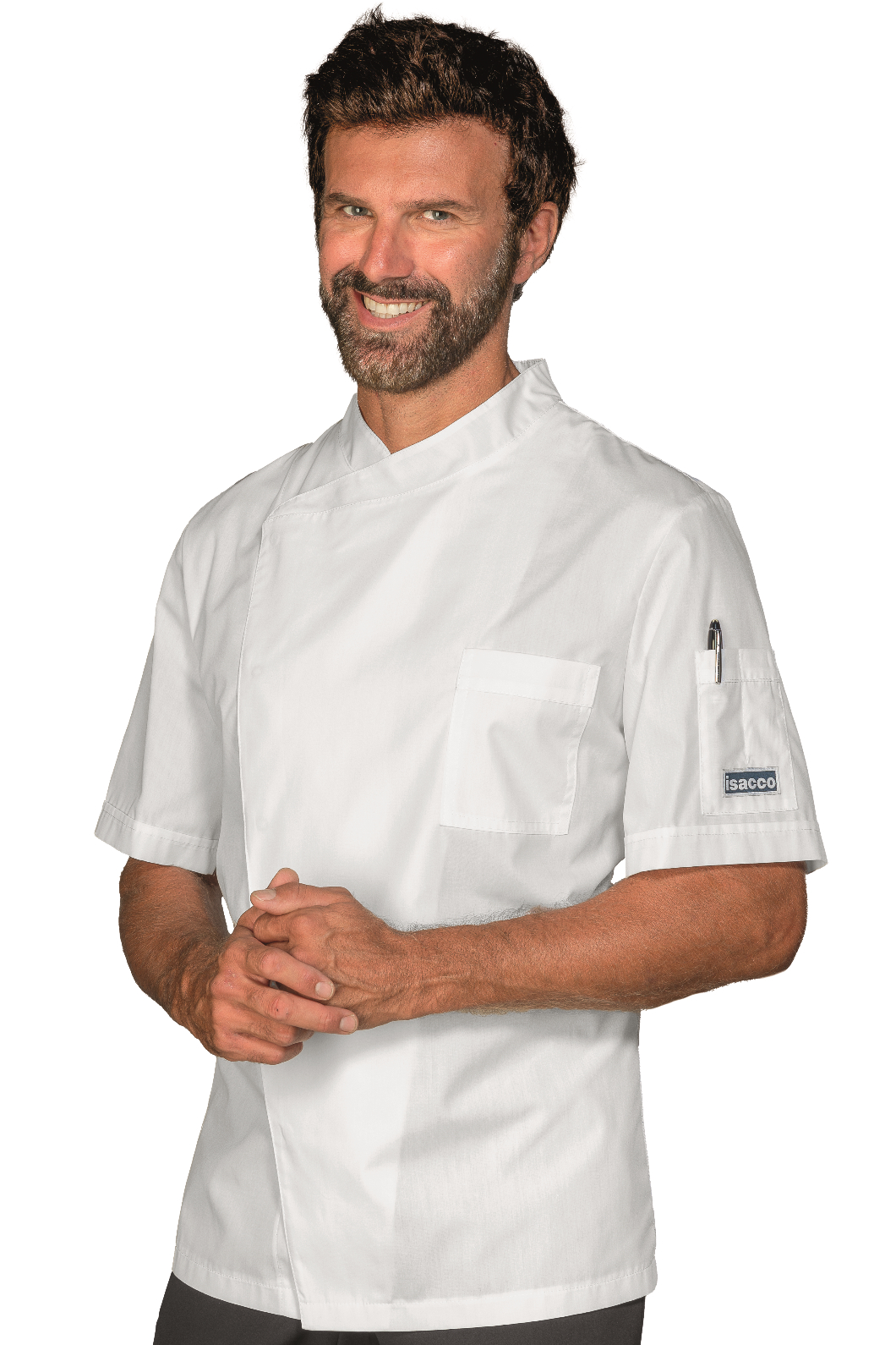La Giacca da Cuoco Classica a manica corta in 11 colori. Ottima divisa per uomo e donna da chef in cucina, ristorante o catering. Giacca da cuoco con taschino alla manica e al petto e allacciatura con bottoni a pressione, modello collo asimmetrico