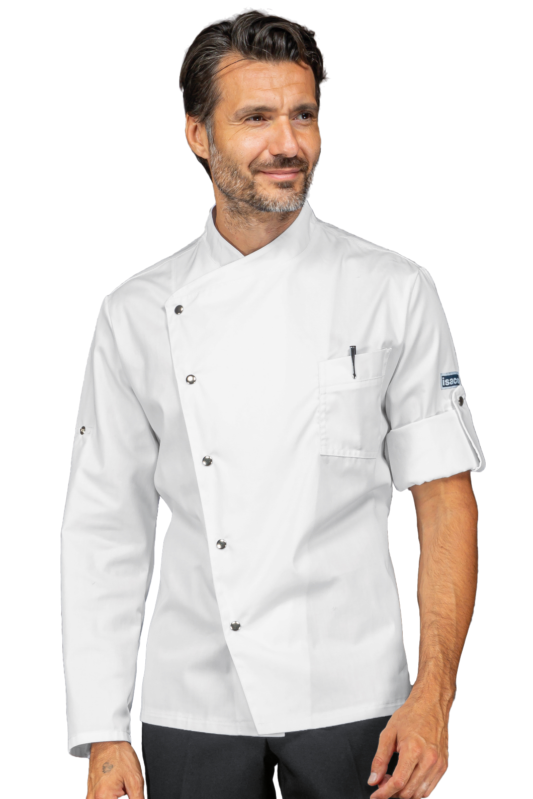 La Giacca da Cuoco Manhattan bianco unisex a manica lunga con martingala. Ideale come divisa per uomo e donna da chef in cucina, ristorante o catering. Allacciatura asimmetrica con bottoni a pressione. Con taschino al petto.