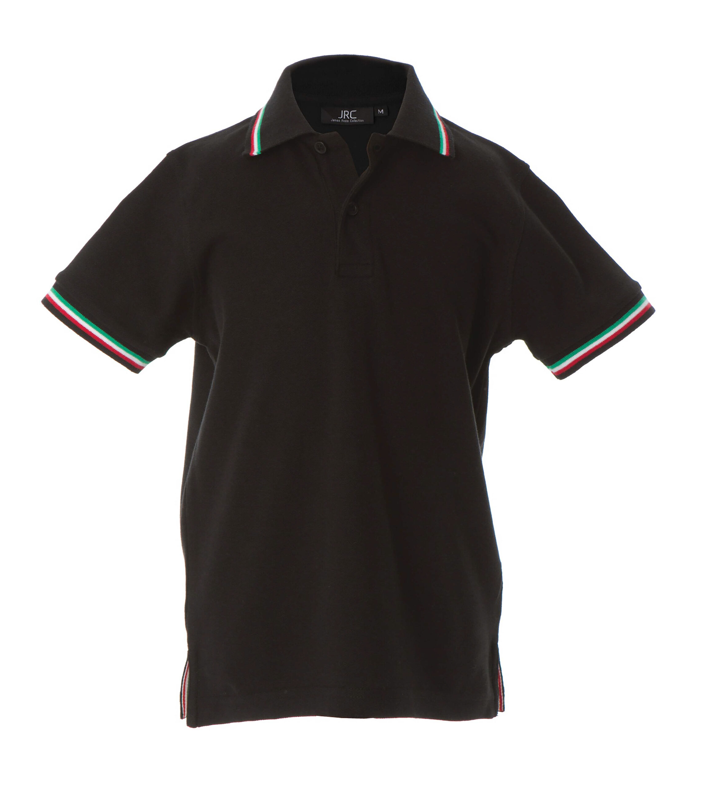– Doppio piping tricolore su colletto e fondo manica in rib